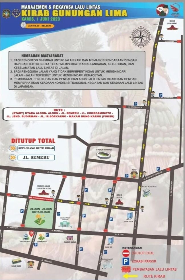 Kota Blitar hari ini menggelar upacara peringatan Hari Lahir Pancasila. Usai upacara ritual Kirab Tumpeng Limo menuju Makam Bung Karno. Untuk itu, Jalan Ir Soekarno ditutup total mulai pukul 06.00 WIB.