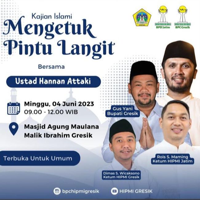 Acara bertajuk Mengetuk Pintu Langit bakal digelar di Masjid Agung Maulana Malik Ibrahim pada Minggu (4/6/2023). Setelah dibaiat beberapa waktu lalu, pengurus Hipmi Gresik mengundang ustaz milenial tersebut ke kota Santri.