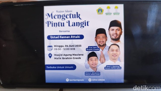 Ustaz Hanan Attaki bakal ceramah di Masjid Agung Maulana Malik Ibrahim Gresik dalam acara Mengetuk Pintu Langit. Sebelum dibaiat menjadi bagian warga NU, Hanan sempat ditolak sejumlah ulama Gresik lantaran dinilai sebagai eks anggota HTI.