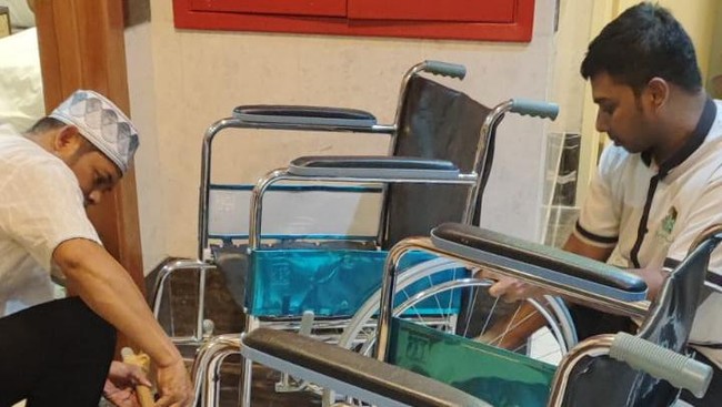 "Alhamdulillah dua kursi roda bisa dimanfaatkan lagi, karena jadwal kami begitu padat, untuk sementara hanya itu yang bisa kami kerjakan. Lansia yang kelelahan berjalan dari kloter 13 bisa bergantian memakainya," imbuhnya.