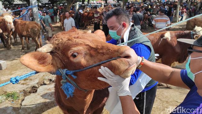Pantauan detikJatim di lokasi, sejumlah petugas dari DKPP Kota Blitar menggelar sidak memantau kesehatan hewan kurban. Kondisi kesehatan fisik sapi yang akan diperjualbelikan dicek satu per satu.