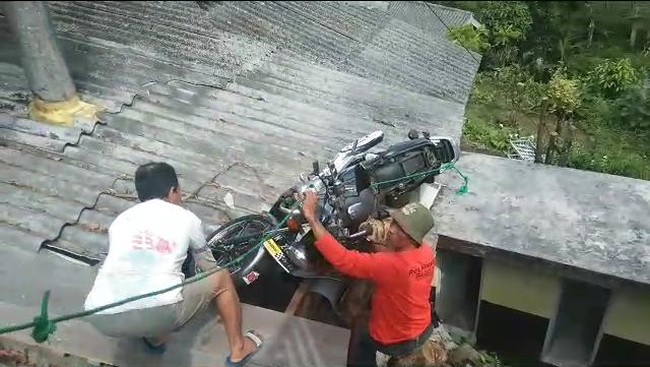 Sejumlah anggota Polsek Trawas sampai turun tangan menurunkan sepeda motor itu. Dibantu para relawan dan warga, polisi menarik motor tersebut dari atap. Petugas juga memasang papan kayu untuk menggeser motor agar tak jatuh ke dalam rumah.