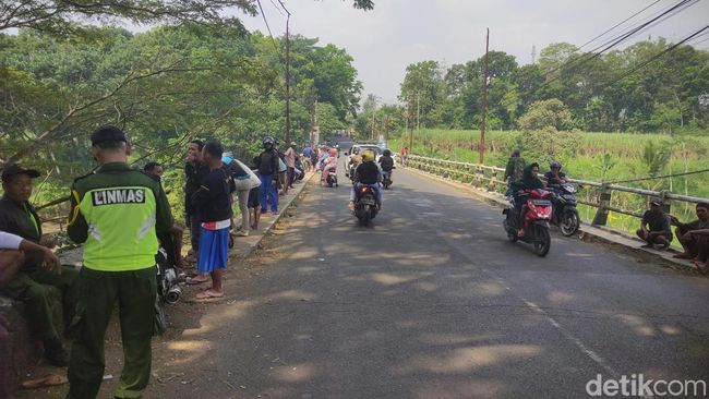 Personel kepolisian dan Linmas terlihat berjaga di sisi selatan bendungan untuk memantau aktivitas warga yang sedang bersiap-siap berburu ikan mabuk.