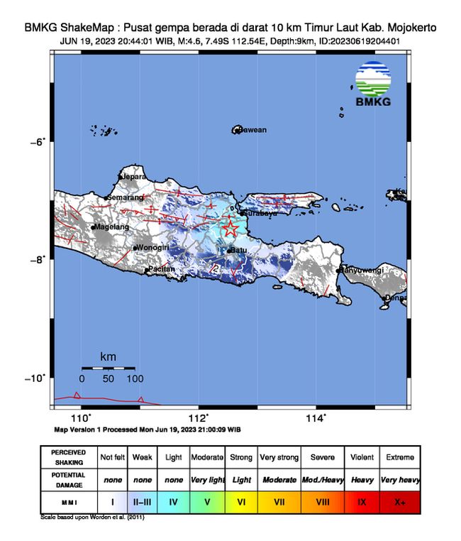 "Pusat gempa berada di darat 10 km Timur Laut Kab. Mojokerto," cuit @infoBMKG, Senin (19/6/2023).
