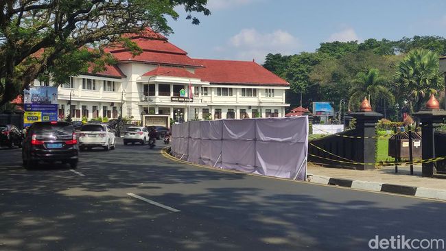 Pantauan detikJatim, pemenang tender mulai mempersiapkan pelaksanaan proyek dengan memasang pembatas warna putih untuk menutup seluruh bagian bundaran Tugu.