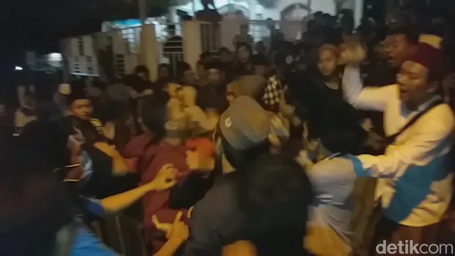 Warga merangsek ke pagar halaman yang ditutup saat pengajian belangsung. Mereka berteriak meminta acara dibubarkan. Warga juga menyanyikan lagu Indonesia Raya.