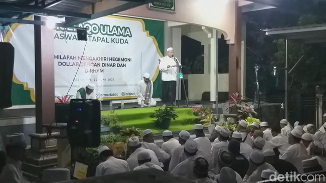 Di panggung tampak banner bertuliskan tema pengajian 'Khilafah Mengakhiri Hegemoni Dolar dengan Dinar dan Dirham'. Tema kontroversial ini memicu amarah warga hingga membubarkan pengajian.