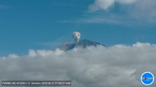 Gunung Semeru kembali erupsi pagi ini sekitar pukul 07.58 WIB, Rabu (21/6/2023). Kali ini, tinggi kolom letusan teramati kurang lebih 600 meter di atas puncak atau sekitar 4.276 meter di atas permukaan laut.