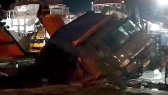 "saat ini ada truk TB terperosok ke laut saat akan masuk ke dalam kapal KMP Perkasa Prima V dikarenakan truk mengalami rem blong," kata Rocky.