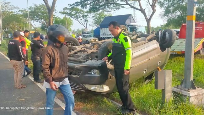 Toyota Kijang Inova terbalik di exit Suramadu sisi Bangkalan. MPV itu terbalik setelah ban belakangnya pecah saat melaju.