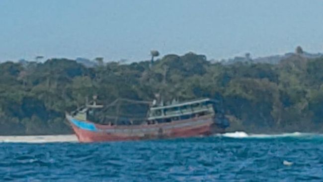 Kapal Nelayan Sumber Berkat menabrak karang di perairan Pantai Gesek Taman Nasional Alas Purwo, Banyuwangi. Begini penampakan kapal yang mengangkut 29 Anak Buah Kapal (ABK) ini.