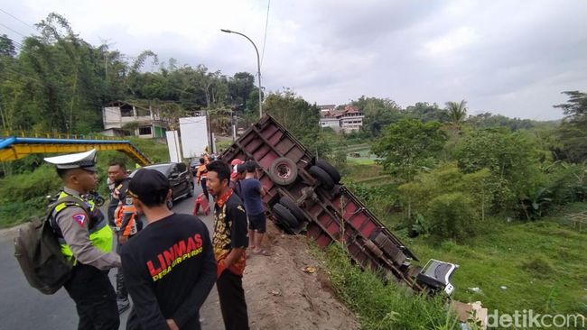 Dalam situasi di luar kendali itu, kendaraan berat itu melaju zigzag hingga akhirnya mengarah terperosok ke arah jurang. Tak ada korban jiwa hanya 2 kernet mengalami luka terkilir.