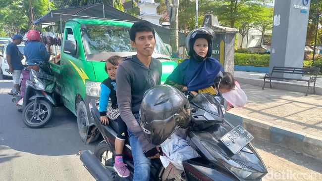 Motor Honda Vario warna hitam yang ditumpangi Musawir tampak sarat penumpang dan muatan saat toron. Pria 29 tahun itu tampak membawa oleh-oleh serta membonceng istri dan dua anaknya yang masih balita.