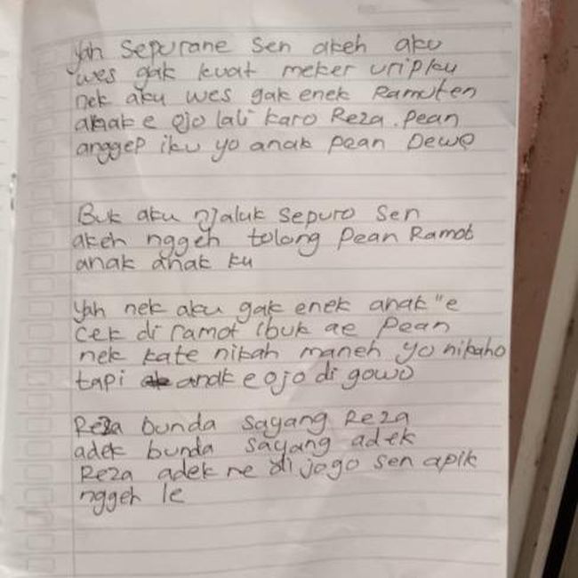 Yah sepurane sen akeh aku wes gak kuat meker uripku. Nek aku wes gak enek ramuten anake. Ojo lali karo R***, pean anggep iku yo anak pean dewe