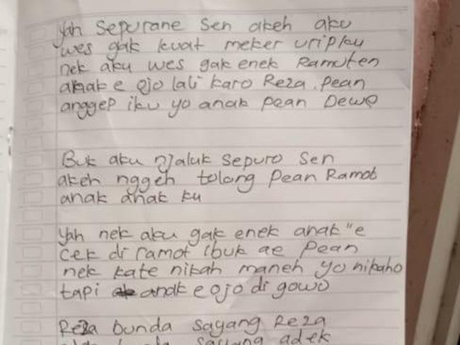Surat wasiat ibu muda di Jombang membuat pilu. Ibu dua anak berinisial DN (31) ini nekat mengakhiri hidup dengan gantung diri di depan anak bungsunya. Sebelum gantung diri, ia sempat menulis wasiat yang isinya menyayat hati.