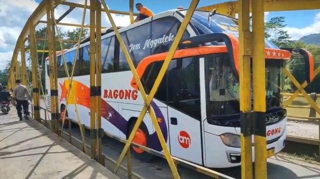 Bus Bagong jurusan Trenggalek-Surabaya tersangkut kerangka Jembatan Plengkung di Trenggalek. Untuk membebaskan bus agar bisa melanjutkan perjalanan, sejumlah kerangka jembatan harus dibongkar.