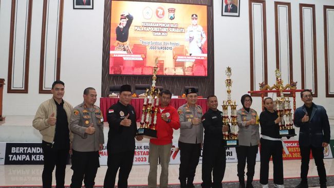 Kejuaraan silat piala Kapolrestabes Surabaya 2023 resmi ditutup. Turnamen Pencak Silat Piala Kapolrestabes Surabaya 2023 digelar sebagai ajang silaturahmi antarperguruan dan pendekar silat.