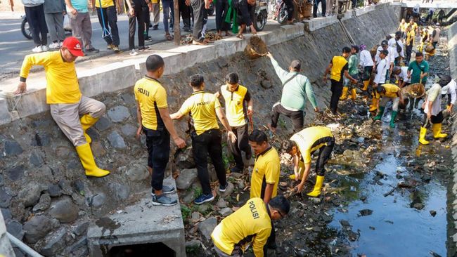 Polres Jombang bersama komunitas Santri Jogo Kali menggelar kerja bakti membersihkan sungai kumuh di Jalan Adityawarman. Kerja bakti ini untuk menciptakan lingkungan yang bersih dan nyaman, serta mencegah banjir.