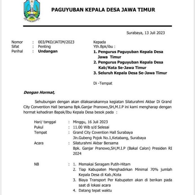 Paguyuban Kepala Desa Jawa Timur menggelar silaturahmi dengan capres PDI Perjuangan Ganjar Pranowo. Dalam surat undangannya, paguyuban menggunakan kop surat berlogo Pemprov Jawa Timur.