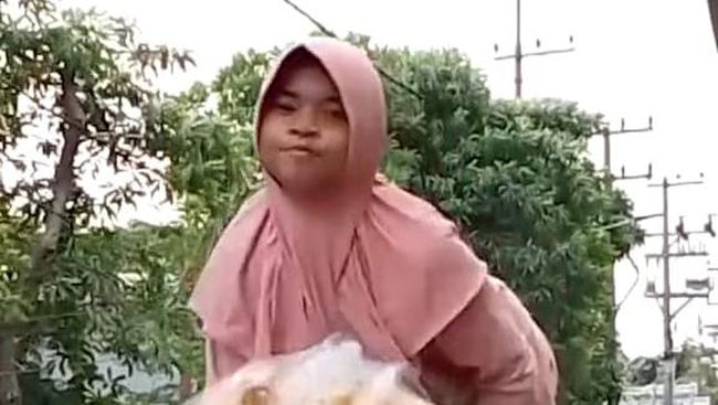 Video berdurasi 38 detik yang diunggah 12 Juli 2023 itu menunjukkan remaja putri itu menggantungkan sejumlah peyek di lehernya sambil menawarkan ke pengguna jalan.
