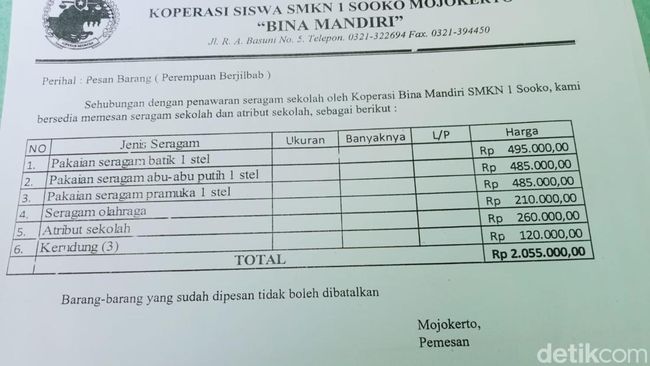 Begitu pula dengan seragam sekolah. Herni menambahkan, biaya seragam Rp 1,7 juta untuk membeli kain 1 stel abu-abu putih, kain 1 stel seragam Pramuka, kain 1 stel seragam khas, seragam olahraga, sepasang sepatu, serta atribut dari topi, jilbab, sampai kaus kaki.