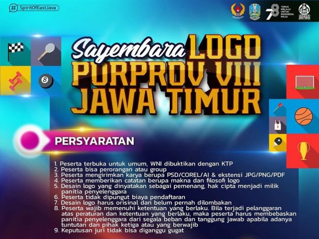 "Syarat utama sayembara ini adalah logo yang dilombakan harus original dan belum pernah diikutkan dalam lomba manapun. Dan desain logo yang dinyatakan sebagai pemenang maka hak cipta akan menjadi hak panitia penyelenggara," kata Kepala Dinas Pemuda dan Olahraga Jatim, M Ali Kuncoro.