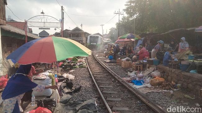 "Eh awas onok sepur (Ada kereta api) lewat," teriak Febi, seorang penjaga parkir di sekitar lokasi pasar tersebut sembari meniupkan peluitnya, Jumat (28/7/2023).