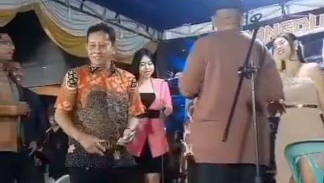 Tak lama, kades yang berpakaian batik motif cokelat itu merogoh saku bajunya dan mengeluarkan puluhan uang berwarna biru. Uang ini kemudian disawerkan ke biduan.