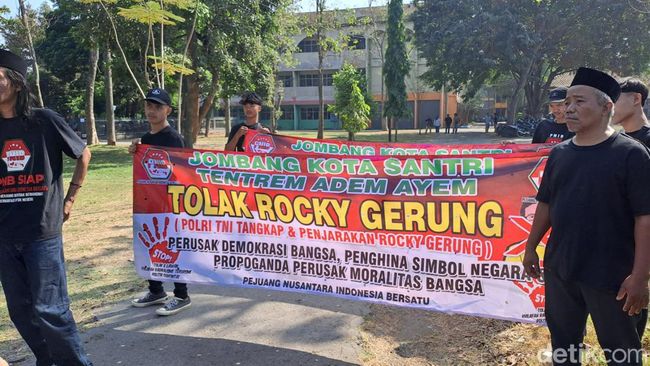 "Kami aksi penolakan, namun Rocky Gerung diizinkan di sini kami hormati karena di-backup bapak-bapak polisi Polres Jombang. Kami silakan acara ini tetap berlangsung, kami hanya meminta Rocky Gerung dijegal dan dibatalkan mengisi acara ini," tandasnya.