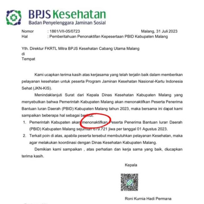 BPJS Kesehatan secara resmi menerbitkan surat Nomor 1861/VII-05/0723 tanggal 31 Juli 2023 untuk menonaktifkan 679.721 peserta PBID di wilayah Kabupaten Malang, pada 31 Juli 2023.