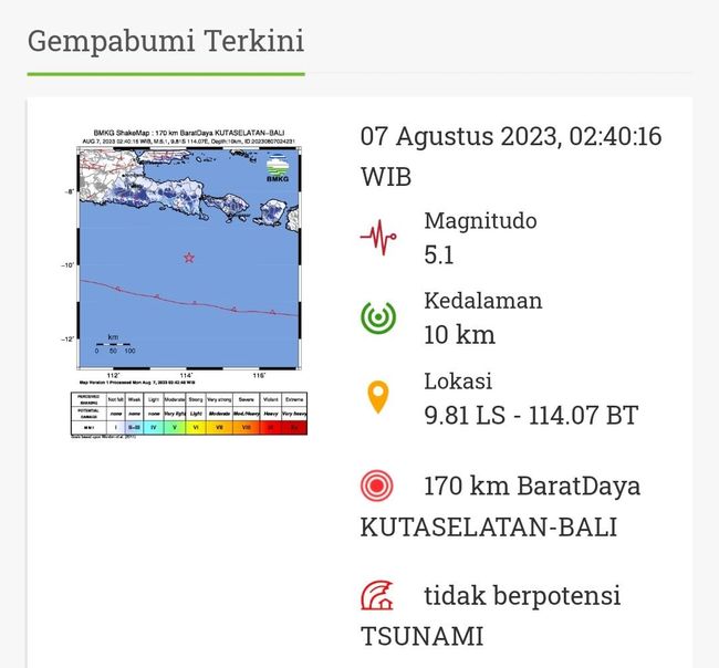 Pagi ini, gempa terasa sekitar pukul 02.00 WIB dengan kekuatan M 5,1 berpusat di Kuta Bali. Dan terbaru sekitar pukul 07.00 WIB dengan kekuatan M 4,1 berpusat di Jembrana-Bali. Keseluruhan gempa tidak berpotensi Tsunami.