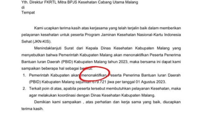 Keputusan Pemkab Malang menonaktifkan sementara 679.721 pemegang kartu BPJS penerima bantuan iuran daerah (PBID) per 1 Agustus 2023 berujung pencoretan 419 ribu lebih peserta dengan alasan anggaran pemkab nyaris jebol. Mulanya, ada penambahan data PBID secara misterius pada Maret 2023.