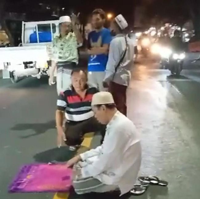 Pria tersebut tampak menggelar sajadah di tengah jalan. Kendaraan yang melintas terpaksa mengurangi kecepatan karena keberadaan pria tersebut.