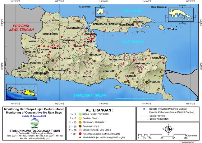 "Kami pantau setiap 10 hari dengan jangkauan 10 hari mundur. Ada daerah yang sudah tidak hujan lebih dari 1-2 bulan. Jika di peta monitoring diwarnai pink," kata Prakirawan BMKG Stasiun Klimatologi Karangploso Malang, Ahmad Lutfi ditemui di kantornya Jalan Zentana, Karangploso, Senin (14/8/2023).