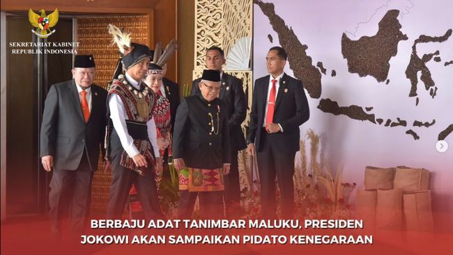 Presiden Jokowi bersama Ibu Negara Iriana Joko Widodo tiba sekitar pukul 08.30 WIB. Kepala Negara tampak mengenakan pakaian adat Tanimbar Maluku dan Ibu Negara mengenakan kebaya berwarna kuning.