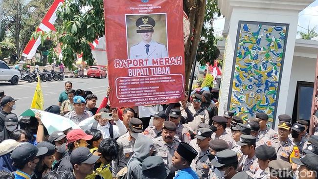 Puluhan mahasiswa yang tergabung dalam Perhimpunan Mahasiswa Islam Indonesia (PMII) demo di kantor Bupati Tuban Aditya Halindra Faridzky. Demo sempat diwarnai aksi saling dorong dengan aparat.