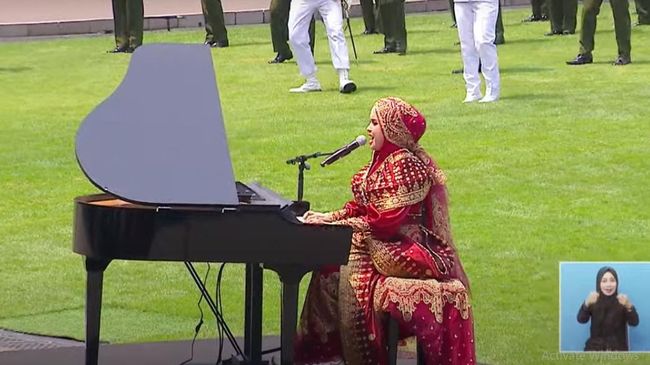 Putri Ariani tampil memukau di Upacara peringatan HUT ke-78 RI di Istana Merdeka. Putri dengan suara khasnya menyanyikan lagu Rungkad.