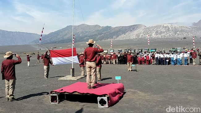 Wisatawan Gunung Bromo dan masyarakat Suku Tengger mengikuti upacara detik-detik proklamasi kemerdekaan ke-78 RI. Upacara ini berlangsung secara khidmat.