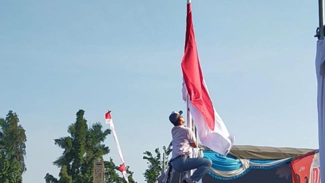 Dia betulkan bendera merah putih yang terlilit di tiang. Saat membetulkan kain bendera, ia hanya berpegangan dengan satu tangan, sementara kedua kakinya dalam posisi menjepit tiang agar tidak melorot atau terjatuh.