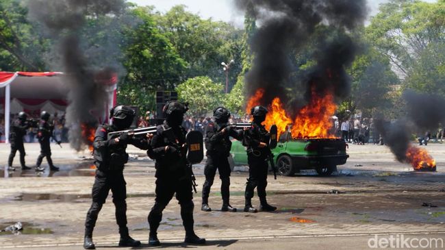 Kerusuhan pecah di lapangan GOR Delta Sidoarjo. Massa yang beringas melempari aparat dan membakar mobil. Situasi chaos itu bukan sebenarnya, namun merupakan rangkaian simulasi sistem pengamanan kota (Sispamkota) jelang Pemilu 2024.