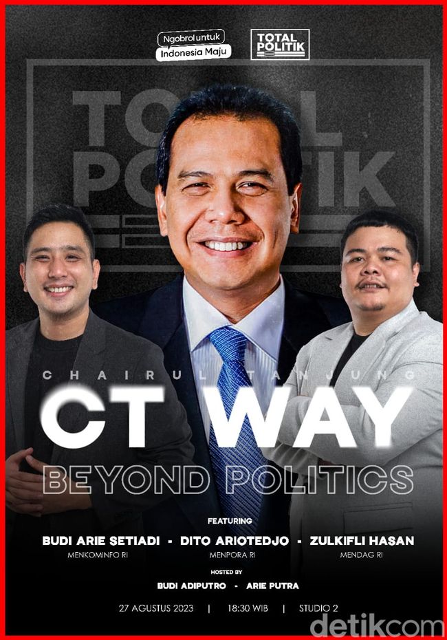 Detikers, jangan lupa nantikan podcast Total Politik yang akan digelar pada Minggu (27/8/2023) pukul 18.30 WIB di XXI Plaza Indonesia. Duo Arie Putra dan Budi Adiputro akan menggali perspektif CT Way tentang kondisi Indonesia mulai ekonomi, digitalisasi sampai tantangan geopolitik global.