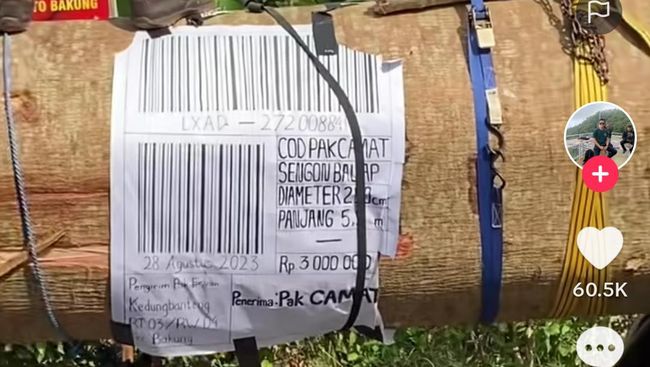 Sementara gerobak di bagian belakang mengangkut ujung batang kayu tersebut. Sebuah kertas dengan gambar barcode paket kiriman ditempel di bagian tengah kayu.