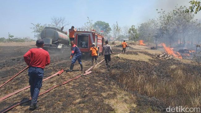 Dari pantauan detik, petugas tampak mengawali pemadaman api di sisi timur dilanjutkan ke sisi bagian selatan, barat, serta sisi utara yang sebagian lahannya terdapat pohon jati.