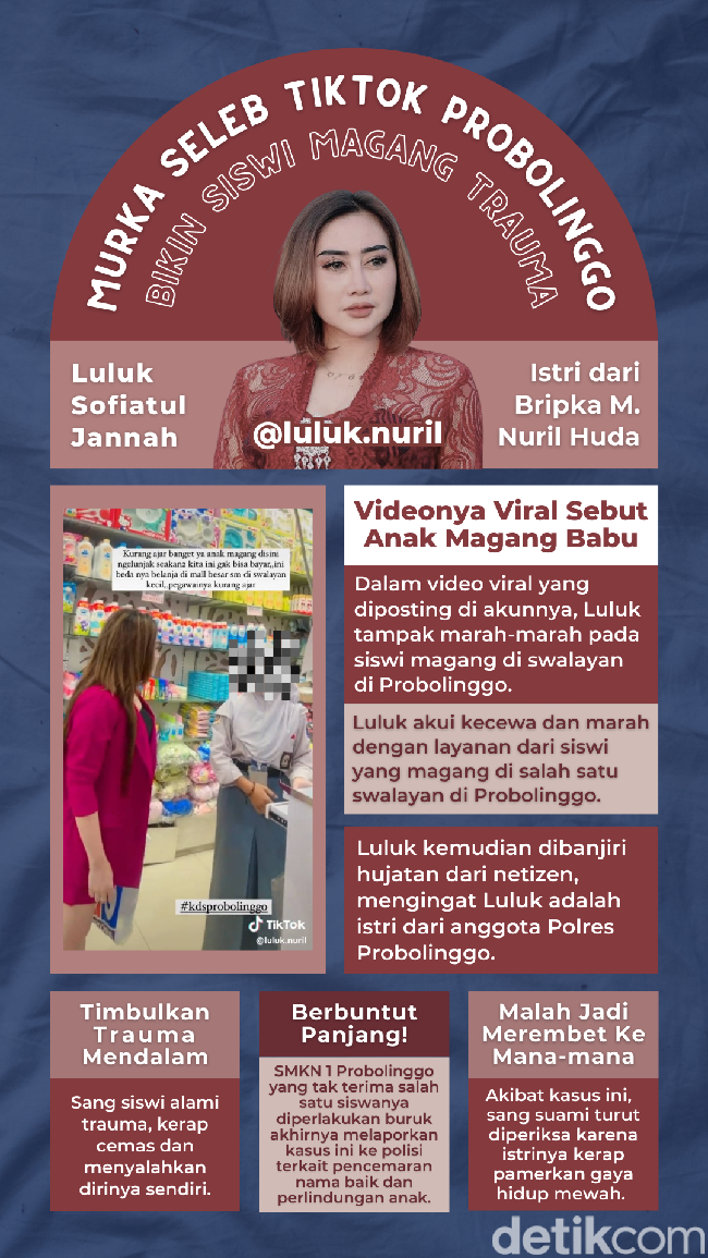 Surabaya - Seleb TikTok asal Probolinggo, Luluk Nuril viral usai memarahi siswi SMKN 1 Kota Probolinggo yang magang di swalayan. Buntut murka sang seleb TikTok, siswi magang tersebut sampai alami trauma mendalam. Simak infografisnya.