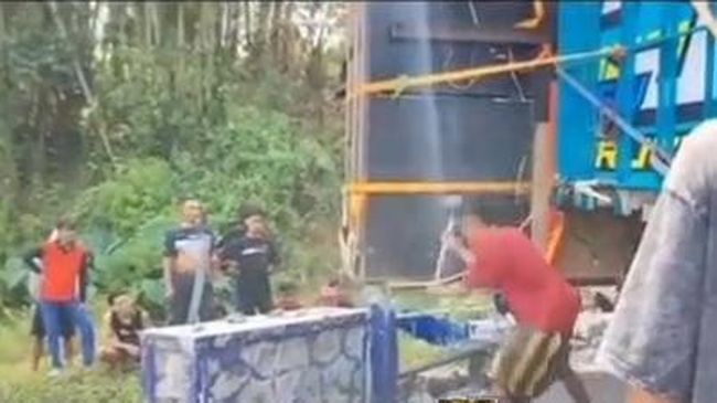 Dalam video berdurasi 1.20 menit itu, tampak sejumlah orang membongkar jembatan. Ini dilakukan agar truk Fuso yang memuat sound system yang melebihi kapasitas luas jalan bisa lewat.
