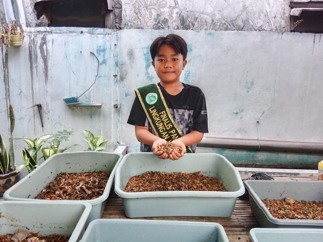 "Kesusahannya waktu awal sampah organik dari warung. Warung belum bisa membedakan sampah organik dan non organik dicampur sama plastik, jadi saya milah2 sendiri," kata bocah yang hobi bersepeda ini.
