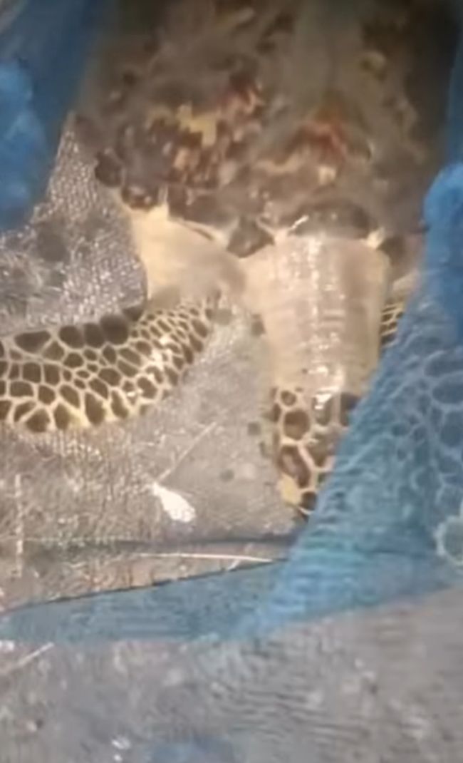 Dalam video yang sama, penyu tersebut dimasukkan ke dalam akuarium. Kemudian terlihat anggota BPBD Surabaya mengecek kondisi penyu tersebut.