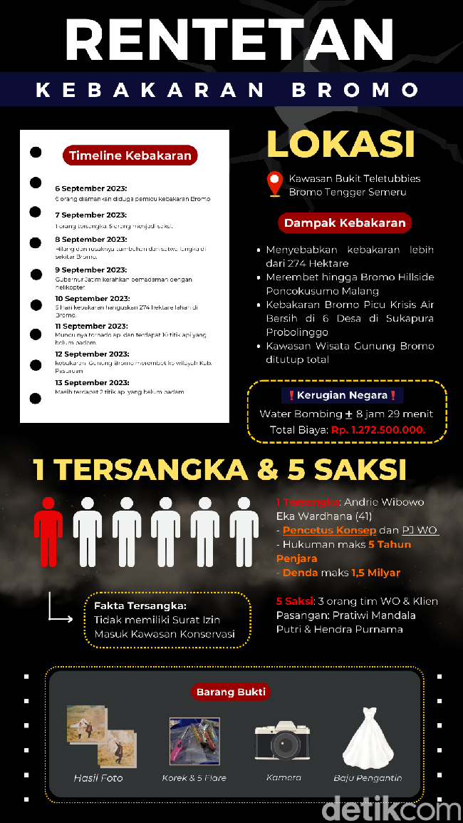 Surabaya - Kebakaran kawasan Gunung Bromo telah berlangsung sembilan hari atau sejak 6 September 2023. Api yang meluas itu disebabkan flare prewedding. Simak rentetan kebakaran Bromo dalam infografis.