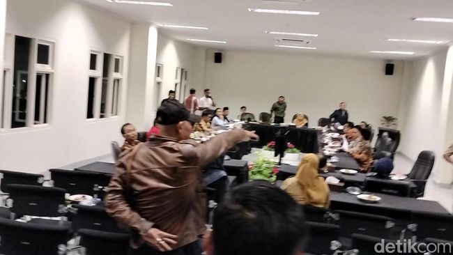 Mereka yang telah lama menunggu di sekitar pintu masuk ruangan sontak melampiaskan kekesalannya. Bahkan, salah satu kades menendang kursi lipat hingga menimbulkan suara cukup keras. Suasana sempat tegang meski rapat sudah selesai dan ditunda Rabu (20/9/2023) pagi.