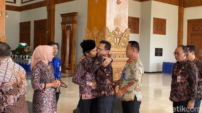 Tidak hanya Sekda Tontro dan pejabat lain seperti Kadis PMD Joko Lelono, Pejabat Asisten Romadhon bahkan menangis sesenggukan saat menyalami dan memeluk Kaji Mbing.